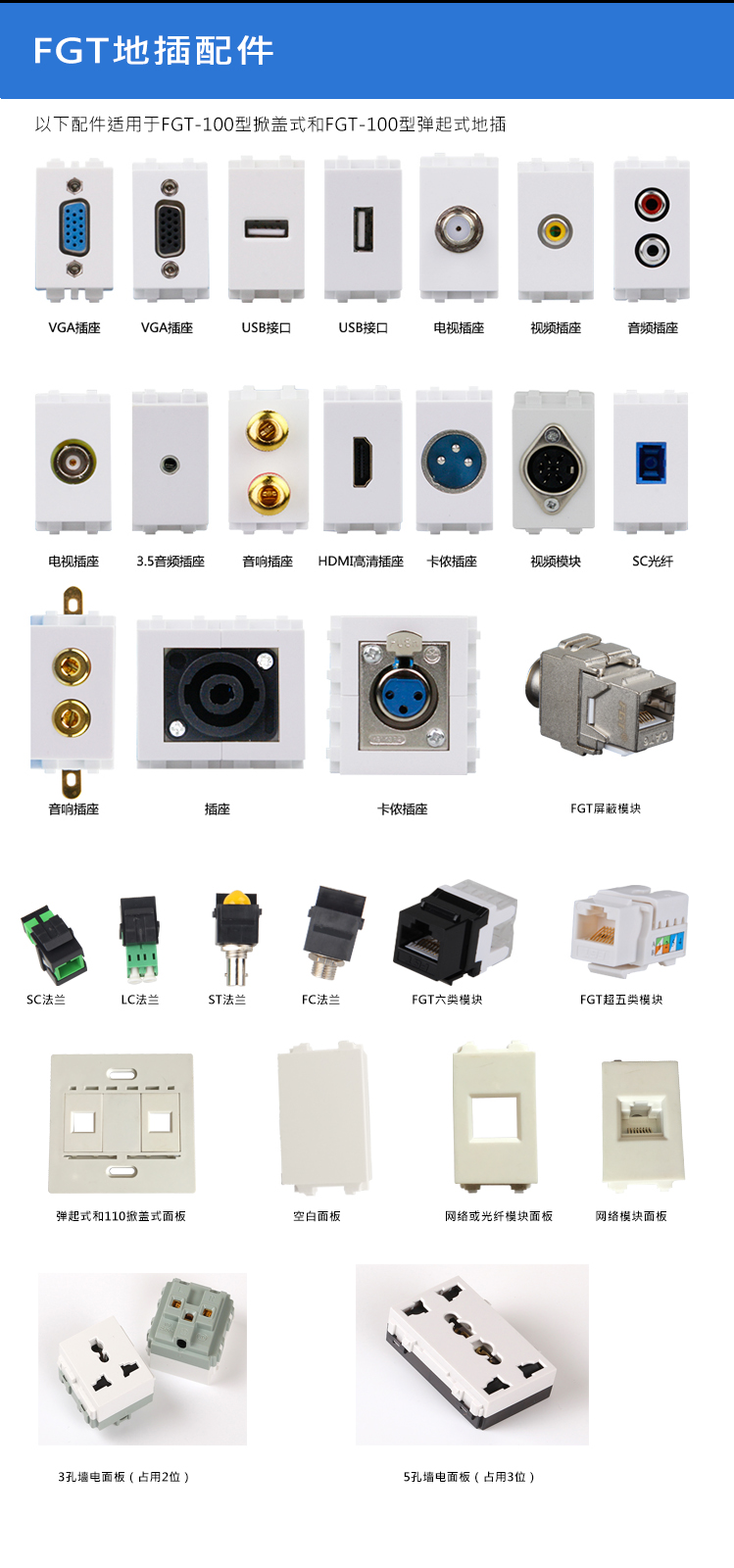 有彈起式和開啟式兩種。可裝配所有FGT系列面板與模塊,不同顏色的模塊可進(jìn)行多網(wǎng)劃分。